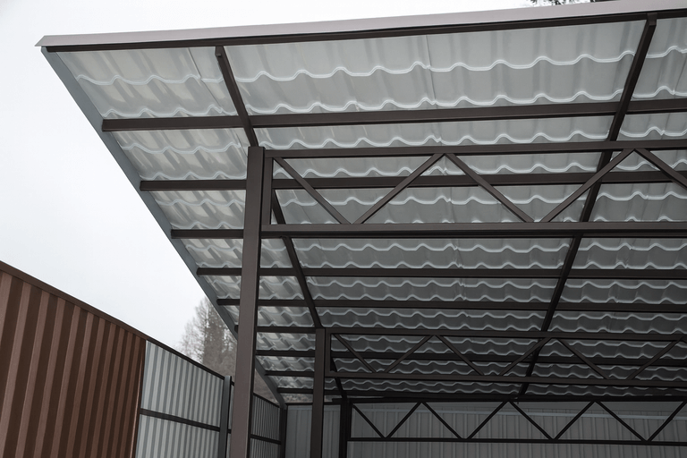 Чем больше площадь перекрытия, тем выше расход материалов и трудозатраты. Для маленьких навесов можно использовать облегчённые решения, тогда как для больших потребуются усиленные опоры и фермы. -